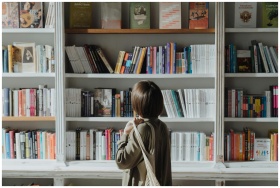 A woman browsing a bookshelf in a well-lit bookstore, exploring various titles.
