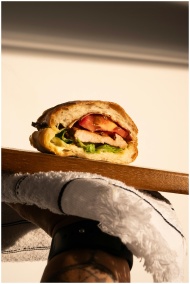 Close-up of a gourmet sandwich with fresh ingredients on a wooden board, side-lit for a dramatic effect.