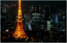 A stunning night view of Tokyo Tower glowing amidst the bustling cityscape of Tokyo.