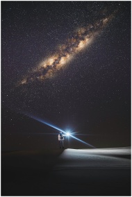 A lone person with a flashlight stands under a starry sky, capturing the beauty of the galaxy.