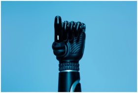 Close-up of a prosthetic arm in a vibrant blue setting, showcasing advanced technology.