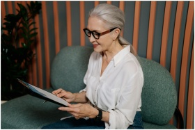 Elderly woman in glasses reviewing documents on cl