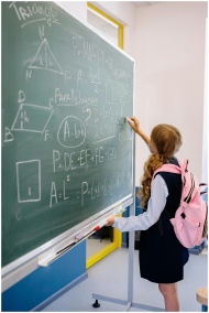Young girl student writing math equations on classroom blackboard during a lesson.
