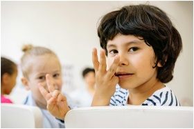 Children engaged in counting activity indoors with focus on learning and happiness.