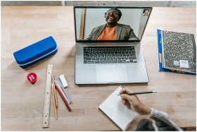 Top view of crop anonymous clever girl taking notes of online lecture on laptop