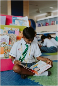 A young student reads intently on the library floor, surrounded by colorful children's books.