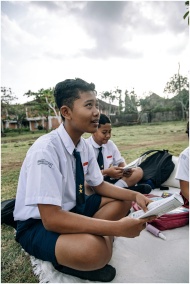 Group of Asian students in school uniforms studying outdoors, promoting learning and education.