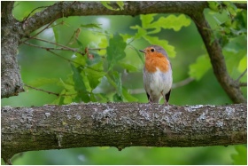 A beautiful European Robin on a tree branch amidst lush spring greenery, symbolizing nature's serenity.