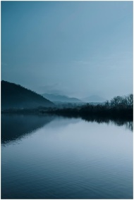 A tranquil lake reflecting misty mountains under a