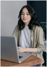 A young woman with black hair working on a laptop