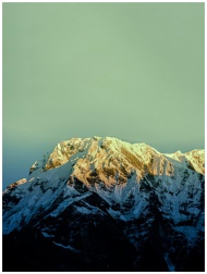 Stunning view of a snow-covered mountain peak illuminated by the gentle sunrise, capturing nature's grandeur.