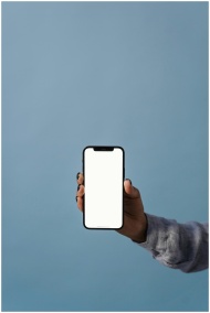 A hand holds a blank-screen smartphone against a blue background, perfect for mockups.