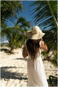 A woman in a sun hat and white dress walks on a sunny tropical beach.