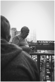 A black and white image of people and vehicles on a busy urban street, showcasing city life.