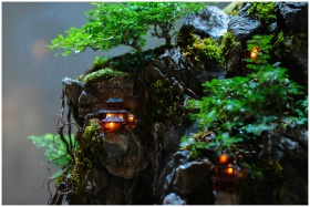 A detailed miniature bonsai landscape featuring illuminated pagodas set on rocky terrain, creating a serene and intricate scene.