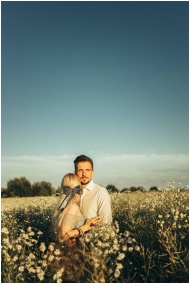 A couple embraces in a lush chamomile field under a clear blue sky.