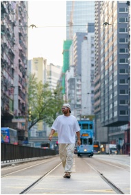 A man walks confidently on a bustling street in Hong Kong, surrounded by vibrant city life.