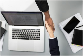 Overhead view of a professional handshake over a laptop, symbolizing business agreement.