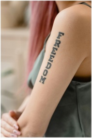 Vertical shot of an arm tattooed with the word 'Freedom', featuring pink hair and soft focus.