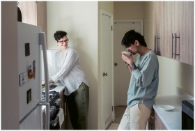 Two people enjoying a relaxed morning in a bright