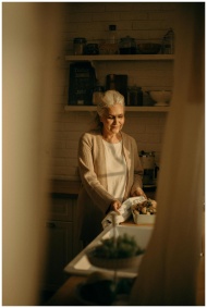 Senior woman with gray hair preparing a meal in a warmly lit kitchen setting.