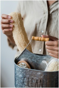 Close-up shot of a person holding a loofah sponge with personal care products, focusing on hygiene.