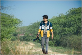 Young man walking on a path through greenery in Delhi, holding a camera.
