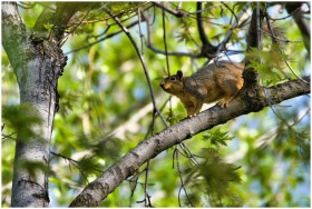 A squirrel perched on a branch, surrounded by fresh green foliage in a vibrant spring forest.
