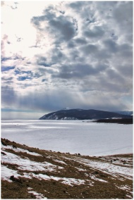 A breathtaking view of a frozen lake with snow-covered mountains under dramatic clouds in winter.