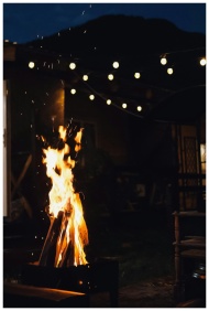 Warm bonfire glowing under string lights, perfect
