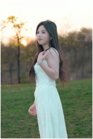 A serene portrait of a woman in a white dress standing outdoors at sunset.