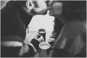 A couple shares a romantic kiss over coffee in a cozy black and white setting.
