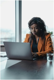 Focused female entrepreneur working on laptop in a