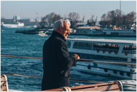 Elderly man on a ferry in Istanbul, enjoying the scenic view of the Bosphorus.