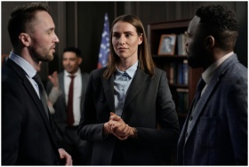 A diverse group of professionals in formal attire discussing business strategies indoors.