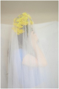 Stylized bridal portrait featuring a woman with a tulle veil and bouquet, captured in soft pastels indoors.