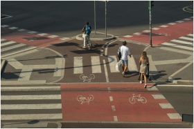 A cyclist and pedestrians crossing a city intersection with marked bike lanes in Milan.