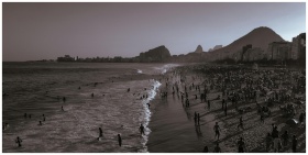 Aerial view of Copacabana Beach in Rio de Janeiro during dusk with vibrant crowds along the shoreline.