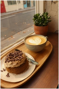 Delicious cappuccino and chocolate cake at a cozy Parisian café window.