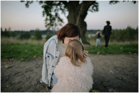 A tender moment between mother and daughter outdoors in a grassy field at twilight.