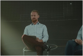 A man holds a meeting in a dimly lit room, engaging with others in a discussion.