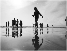 Silhouetted people enjoying a beach day in Goa, India with reflections on wet sand.