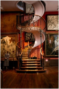 A stunning spiral staircase inside a Parisian art museum adorned with classic paintings.