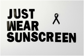 Black ribbon and "Just Wear Sunscreen" message on