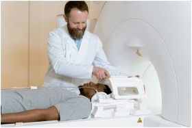 A medical professional assists a patient in an MRI