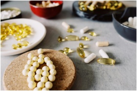 Close-up of assorted pills, capsules, and supplements on a marble surface, emphasizing healthcare and wellness.