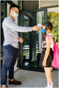Teacher checks student's temperature at school entrance as part of pandemic safety measures.