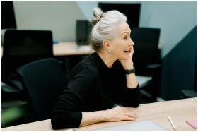 Senior businesswoman smiling at a desk in a modern office, conveying positivity and leadership.