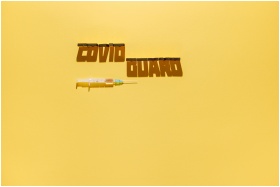 Creative healthcare concept with syringe and 'COVID GUARD' text shadow on yellow background.