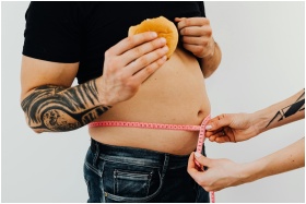 A man with tattoos holding a burger as another person measures his waistline with a tape measure.